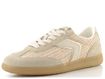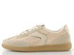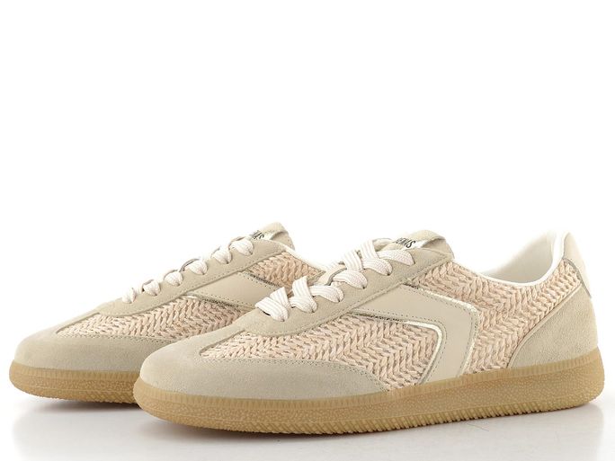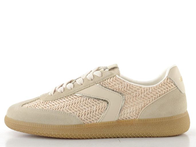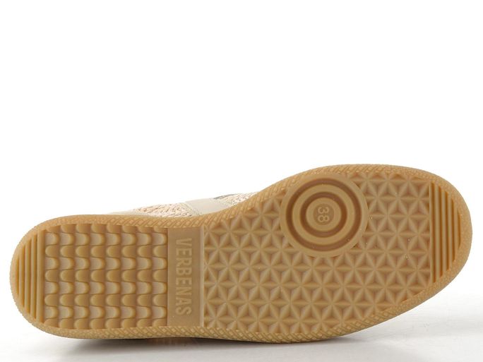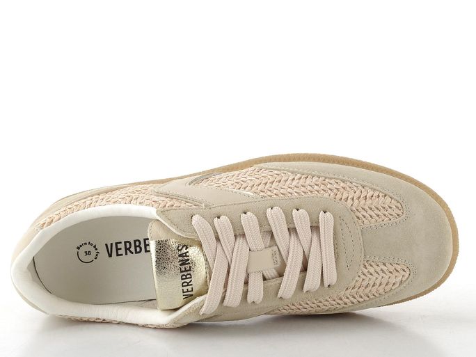 Luxusní dámské tenisky od španělské značky Verbenas spojují elegantní design s maximálním komfortem. Svršek z kombinace broušené kůže a umělého splétaného lýka v světlých béžových odstínech s metalickými platinovými doplňky dodává botám jedinečný vzhled. Klasické šněrování s plochými tkaničkami zajišťuje perfektní přizpůsobení, zatímco polstrovaný kotníkový lem a zpevněný vnitřní opatek zvyšují pohodlí při nošení.