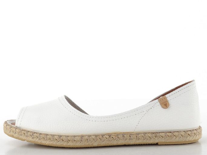 Komfortní kožené dámské espadrilky od značky Verbenas jsou ideální volbou pro jarní a letní dny. Tyto elegantní boty s otevřenou špičkou a kulatým tvarem nabízejí pohodlný prozouvací (slip-on) střih, který usnadňuje obouvání. Svršek je vyroben ze strukturované kůže v bílém provedení, což dodává na stylu.