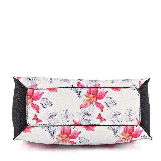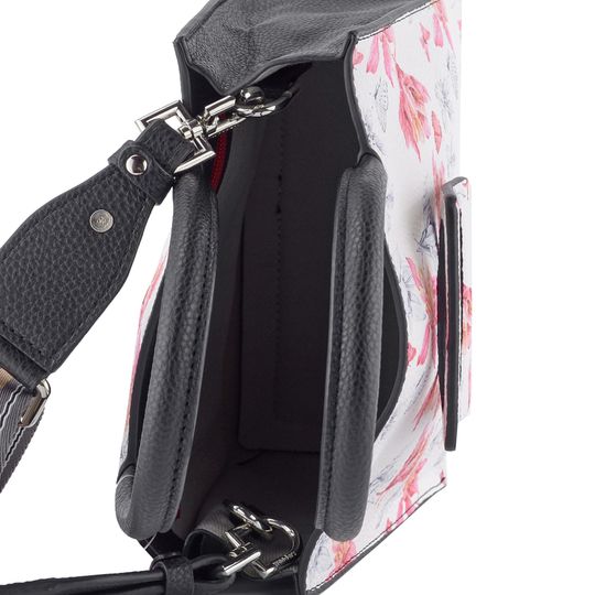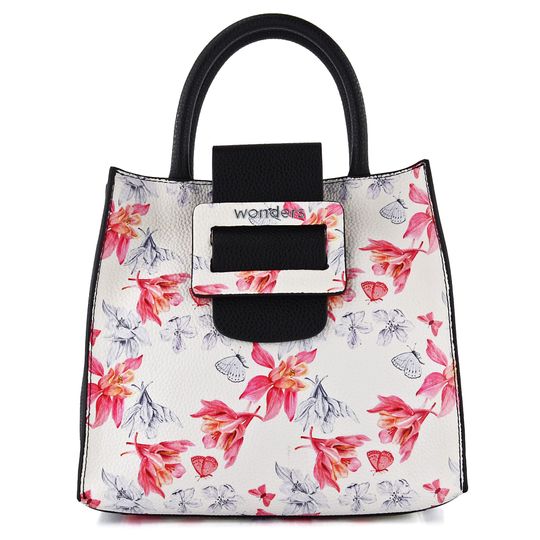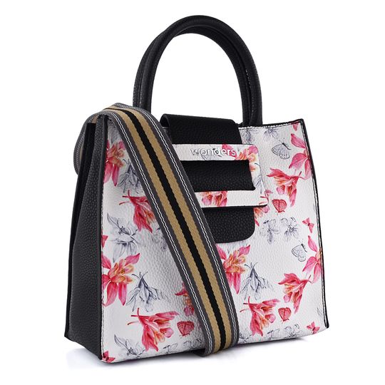 Malá dámská kabelka od značky Wonders je ideální volbou pro každodenní nošení. Je vyrobena ze strukturované syntetiky, která zajišťuje její odolnost a dlouhou životnost. Kabelka má bílý základ s barevným potiskem květů a motýlků, kde převládají růžová a šedomodrá barva, což jí dodává jedinečný vzhled. Doplňková černá barva vytváří pěkný kontrast.