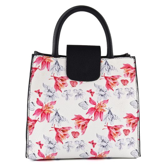 Malá dámská kabelka do ruky nebo přes rameno s veselým motivem květin a motýlků.