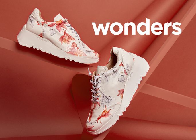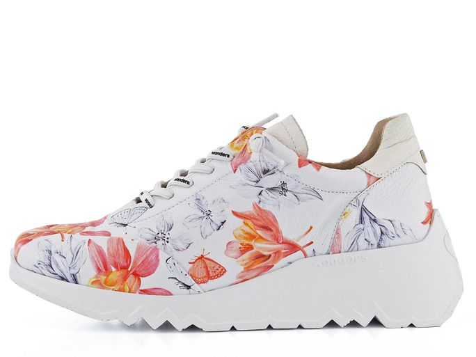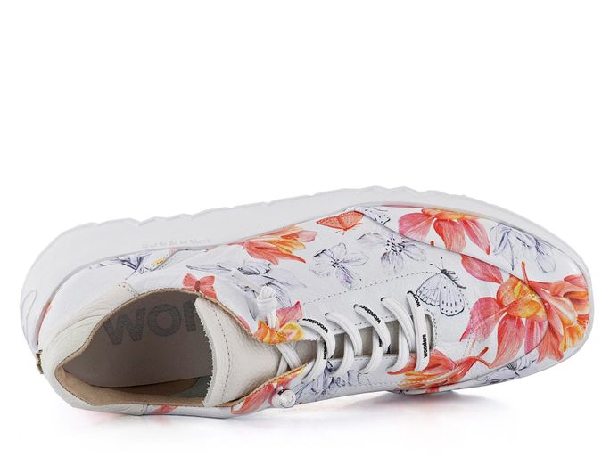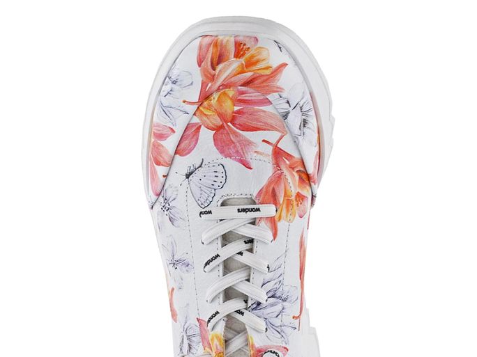 Designové kožené dámské polobotky na klínku, v bílém provedení s potiskem květin a s pružným šněrováním.