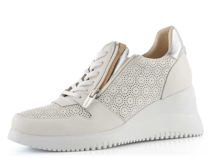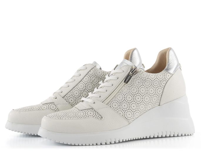 Stylové a pohodlné tenisky značky Wonders jsou ideální volbou pro každou ženu, která hledá kombinaci elegance a komfortu. Tyto tenisky vynikají svým svrškem z poddajné strukturované kůže v jemné smetanové barvě s odraženou bílou. Ozdobná jemná perforace dodává botám jedinečný vzhled, zatímco jazyk a patní část ve stříbrné barvě přidávají moderní nádech.