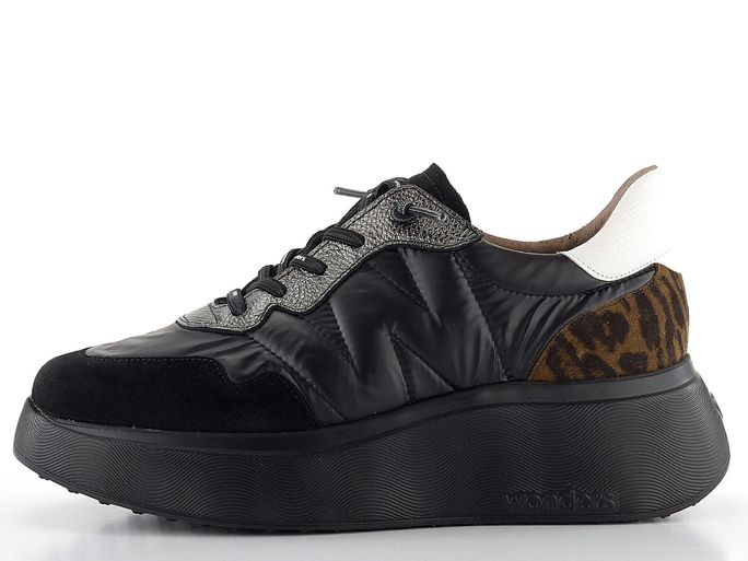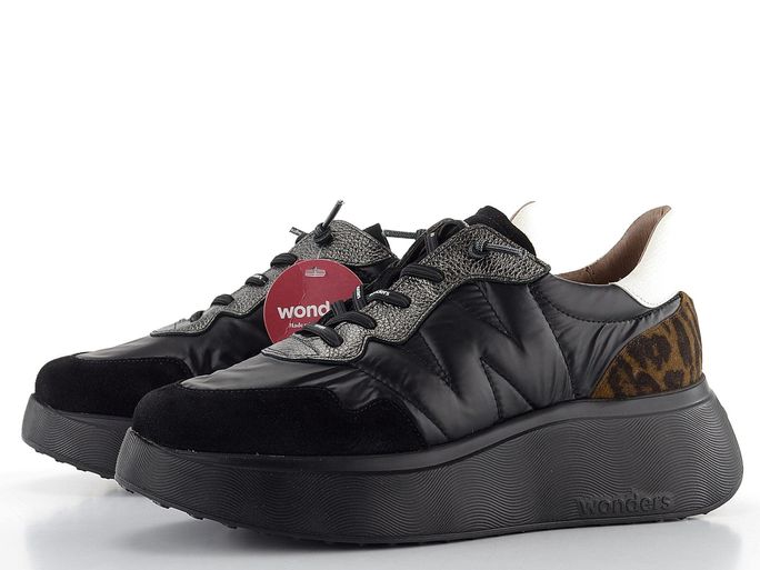 Pro ženy, které hledají styl a komfort, jsou tu dámské tenisky na platformě od španělské značky Wonders. Tyto prozouvací polobotky s kulatou špičkou kombinují strukturovanou, vzorovanou a semišovou kůži s textilií, což jim dodává jedinečný vzhled. Černá šusťákovina je doplněna kovově stříbrnou, odraženou bílou a hnědou barvou, což vytváří elegantní a moderní design.
