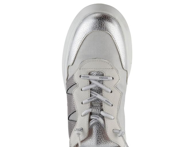Dámské tenisky na platformě od španělské značky Wonders kombinují styl a komfort. Jsou ideální pro moderní ženu, která hledá autentický design a trvalou kvalitu. Svršek je tvořen strukturovanou kůží a textilií, což vytváří unikátní vzhled v odstínech šedé a stříbrné. Pružné šněrování zakončené uzlíky zajišťuje snadné nazouvání. Uvnitř najdete koženou podšívku a vyjímatelnou vložku s technologií MemoryGel®, která poskytuje maximální pohodlí. Odlehčená podešev s klínkem a výškou podpatku 5,5 cm dodává botám moderní vzhled a zajišťuje pohodlnou chůzi po celý den.
