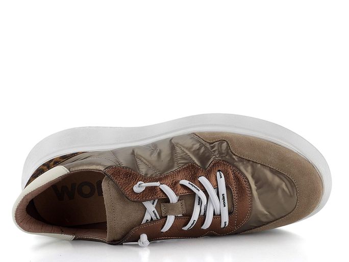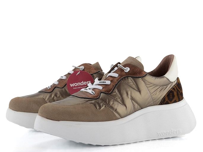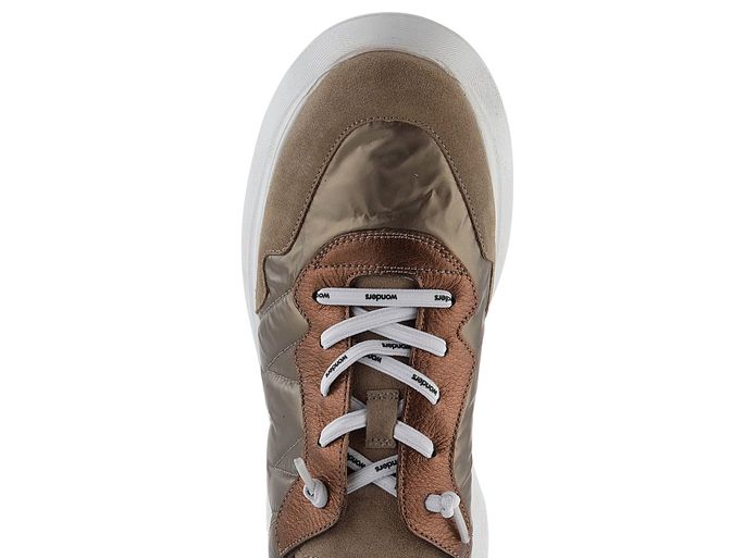 Stylové dámské tenisky na platformě od španělské značky Wonders jsou ideální volbou pro podzimní a zimní sezónu. Kombinace strukturované, vzorované a semišové kůže s textilií vytváří jedinečný vzhled, který upoutá pozornost. Lesklá taupe šusťákovina je doplněna bronzovou, odraženou bílou a hnědou barvou, což dodává teniskám moderní a sofistikovaný vzhled.