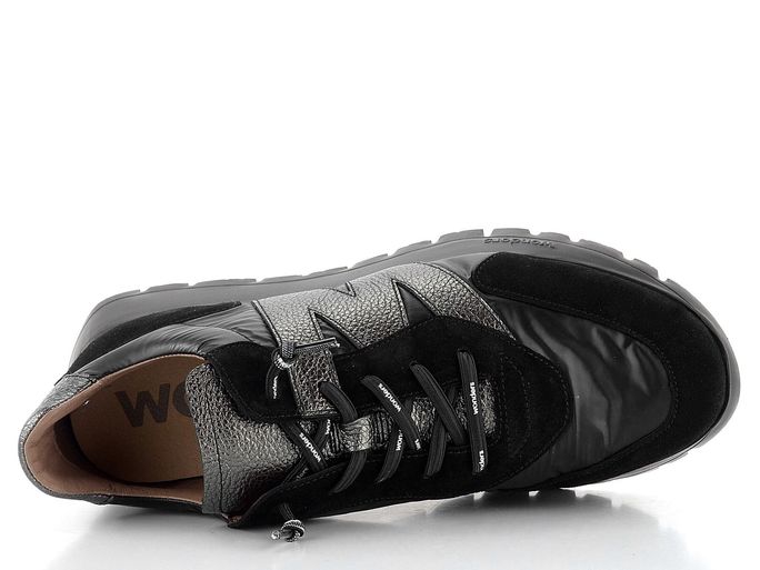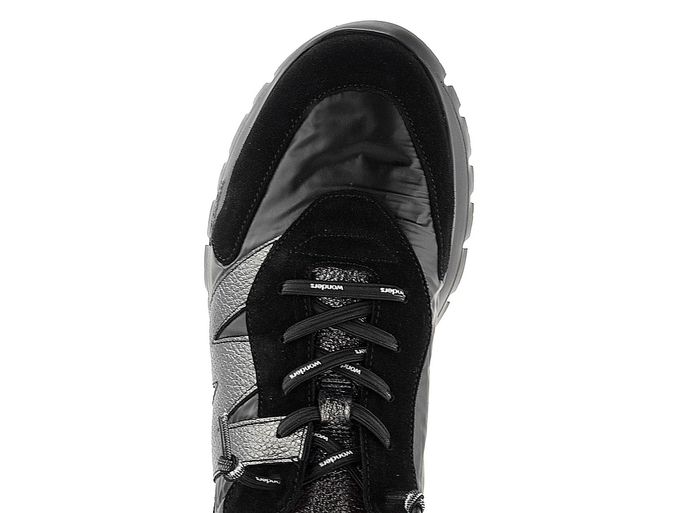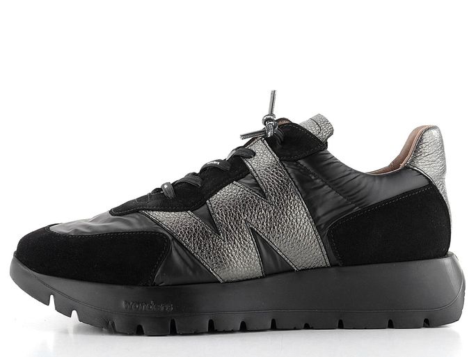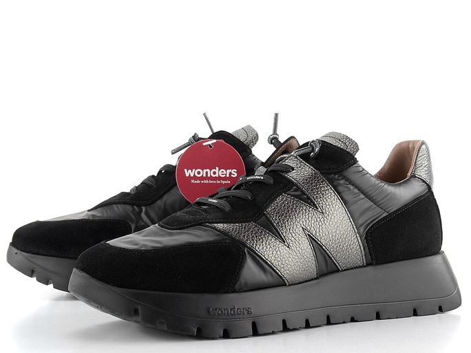Stylové dámské tenisky od španělské značky Wonders přinášejí kombinaci elegance a pohodlí, ideální na podzim a zimu. Tyto prozouvací polobotky zaujmou svým kulatým tvarem špičky a svrškem z kvalitní strukturované a semišové kůže doplněné textilií. Černá barva je oživena metalickým kouřově šedým odstínem, což dodává botám moderní vzhled.