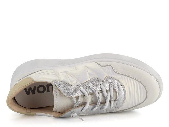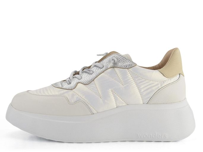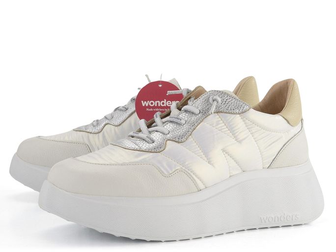 Dámské stylové prozouvací polobotky na platformě od španělské značky Wonders jsou ideální volbou pro jarní a letní sezónu. Tyto tenisky kombinují strukturovanou a metalickou kůži s textilií, což jim dodává jedinečný vzhled. Perleťově bílá šusťákovina je doplněna stříbrnými a světle béžovými akcenty, které zajišťují elegantní a moderní vzhled.