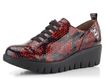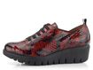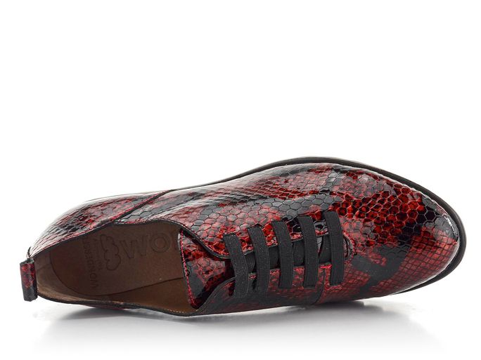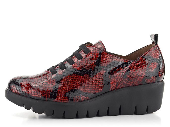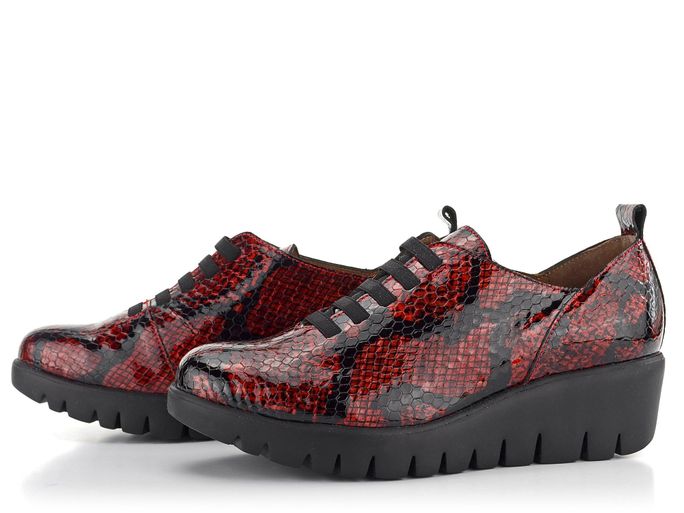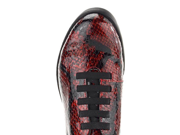 Dámské polobotky z lakované kůže s hadinkovým vzorem v červeno-černé kombinaci, s pružným šněrováním a na vyšší platformě s klínkem.