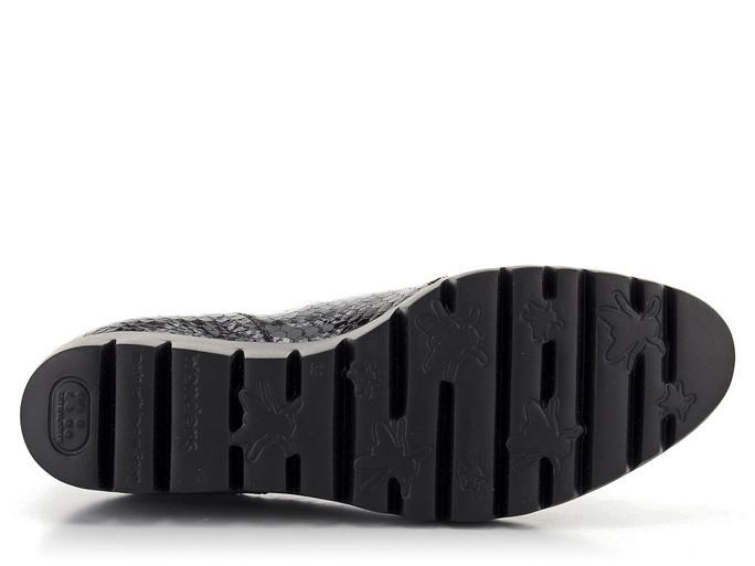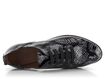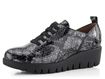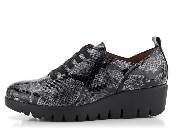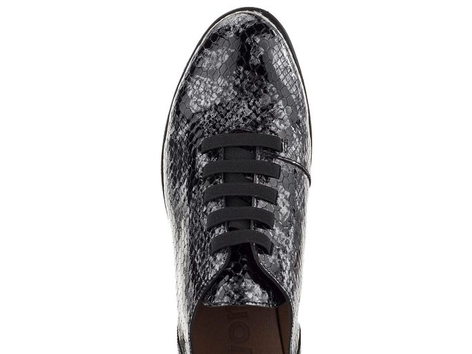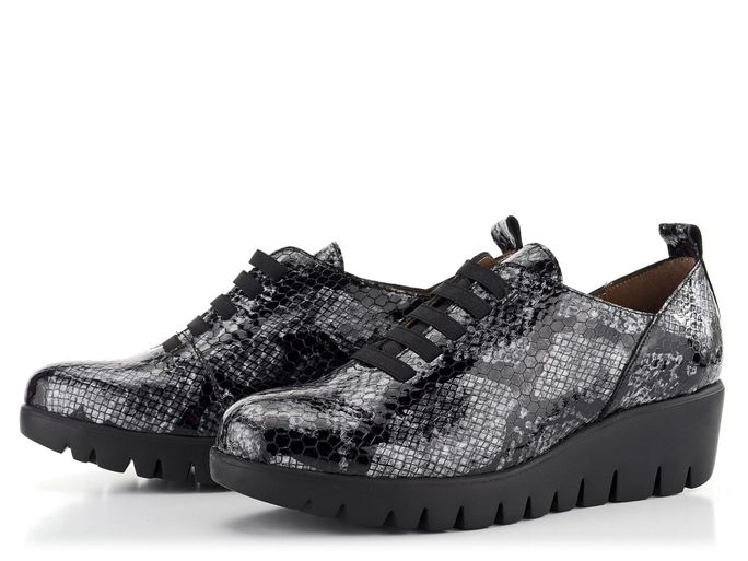 Dámské polobotky z lakované kůže s hadinkovým vzorem v šedo-černé kombinaci, s pružným šněrováním a na vyšší platformě s klínkem.