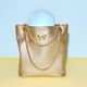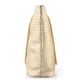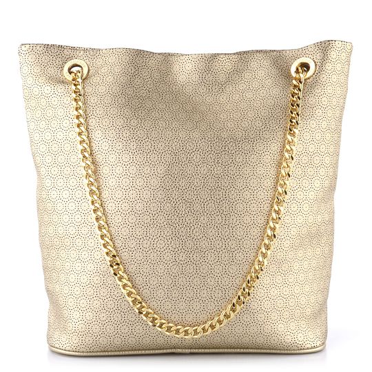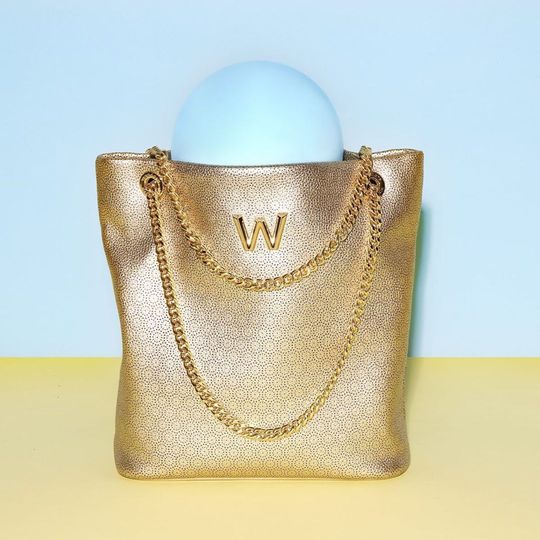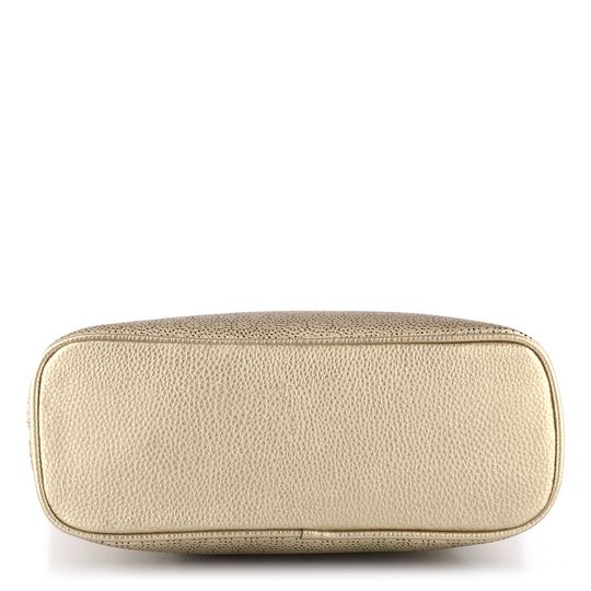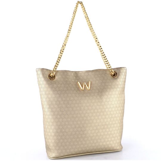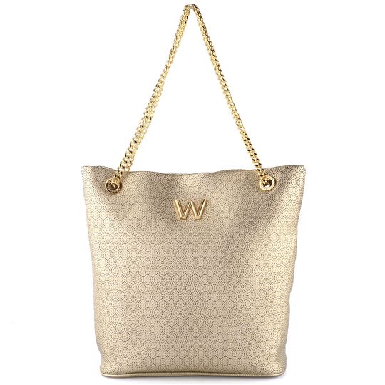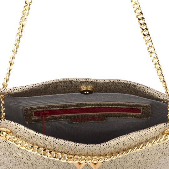 Dámská kabelka s řetízkovým uchem v platinově zlaté barvě s drobným propalovaným vzorem.