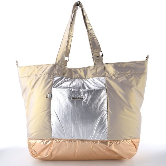 Dámská prostorná kabelka přes rameno v kombinaci metalických barev.