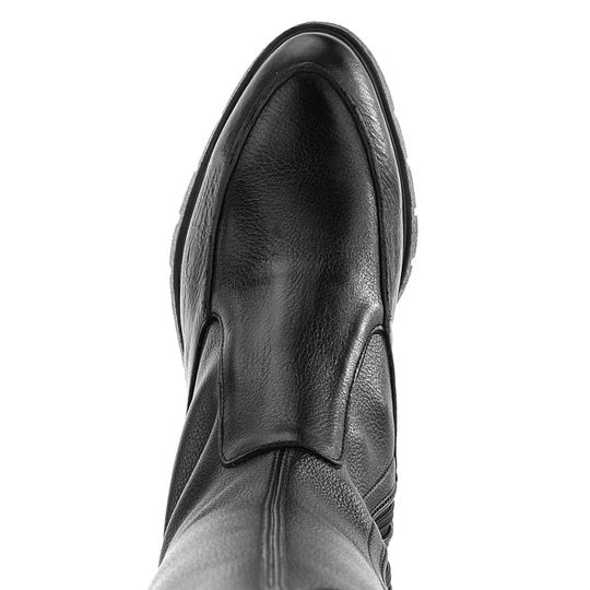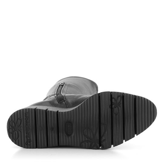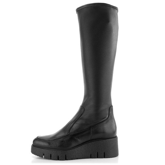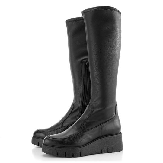 Zajímavé dámské kozačky s mírně pružným materiálem v lýtkové části a na vyšší platformě s klínkem.