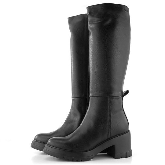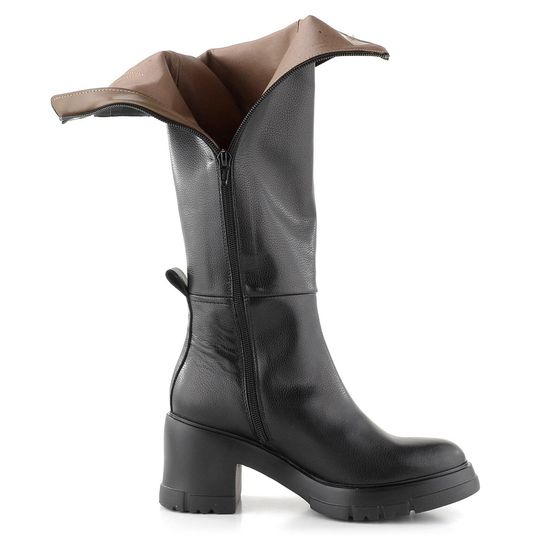 Nezateplené dámské kozačky z hladké kůže černé barvě, s koženou podšívkou a vyšší platformou se širokým podpatkem.