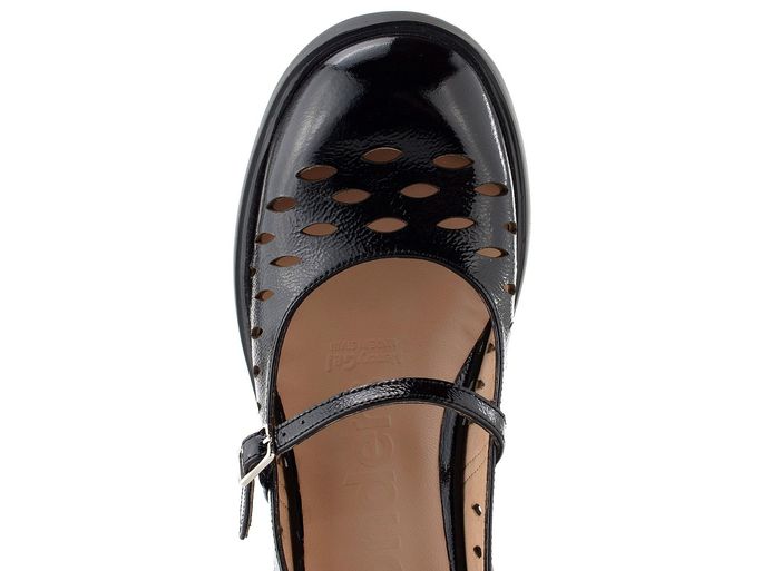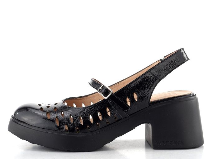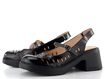 Dámské prořezávané lodičky z lakované kůže s volnou patou, vysokou platformou a designovým širokým podpatkem.