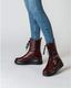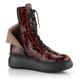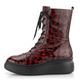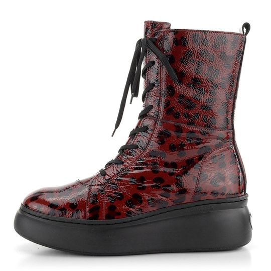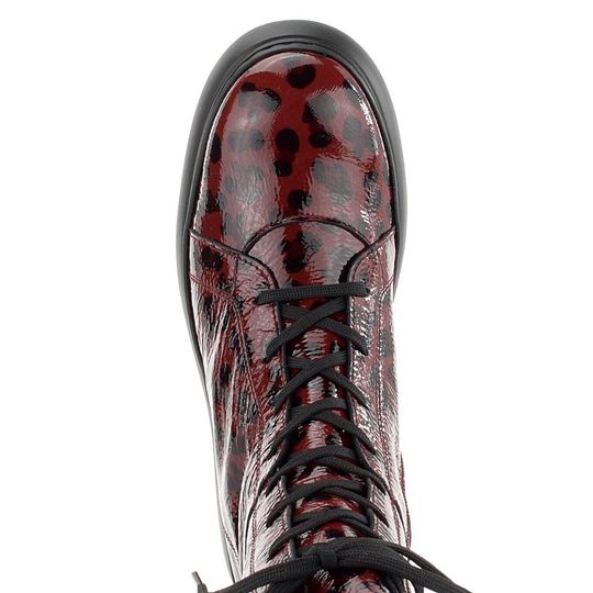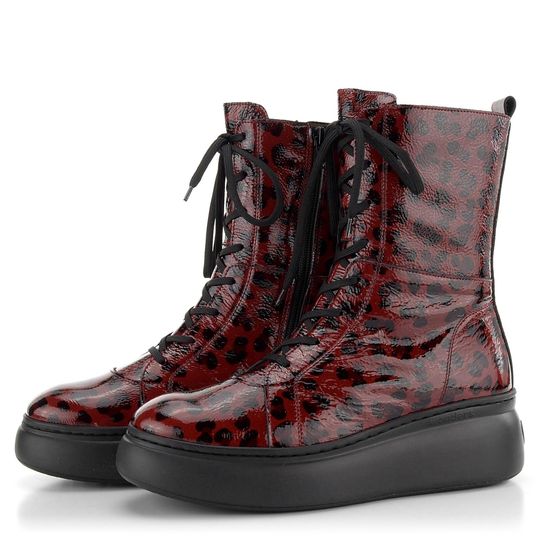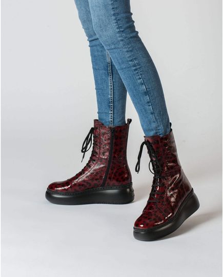 Nepřehlédnutelný dámský kotník z mačkané lakované kůže, se šněrováním, postranním zipem a vysokou platformou.
