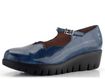 Dámské lodičky z lakované kůže ve stínované modré barvě, na vyšší odlehčené platformě s klínkem.
