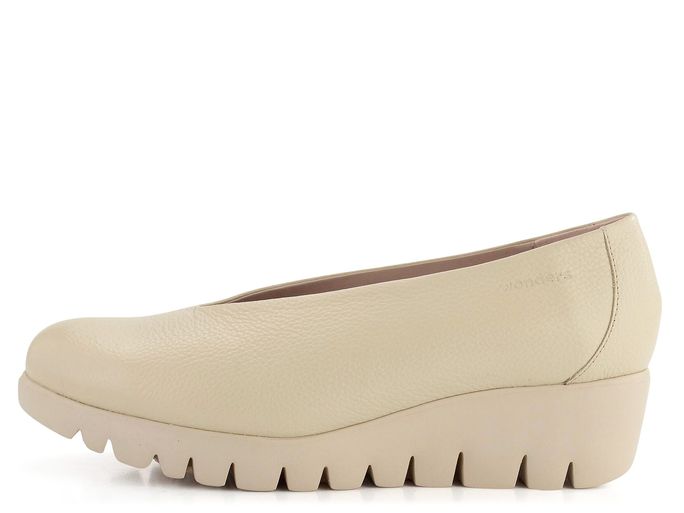Dopřejte si eleganci a pohodlí s dámskými lodičkami na klínu od značky Wonders. Tyto lodičky se pyšní svrškem ze strukturované kůže v jemné krémové barvě, která snadno doplní váš jarní a letní šatník. Elegantní střih s kulatou špičkou a tvarovaný okraj na nártu dodávají botám sofistikovaný vzhled.