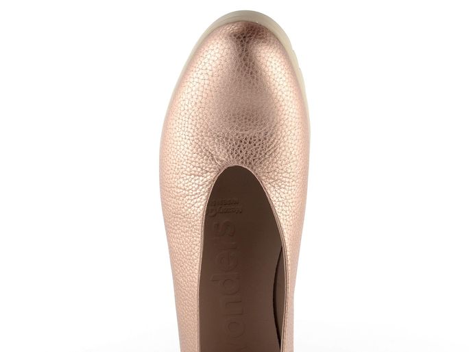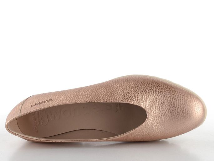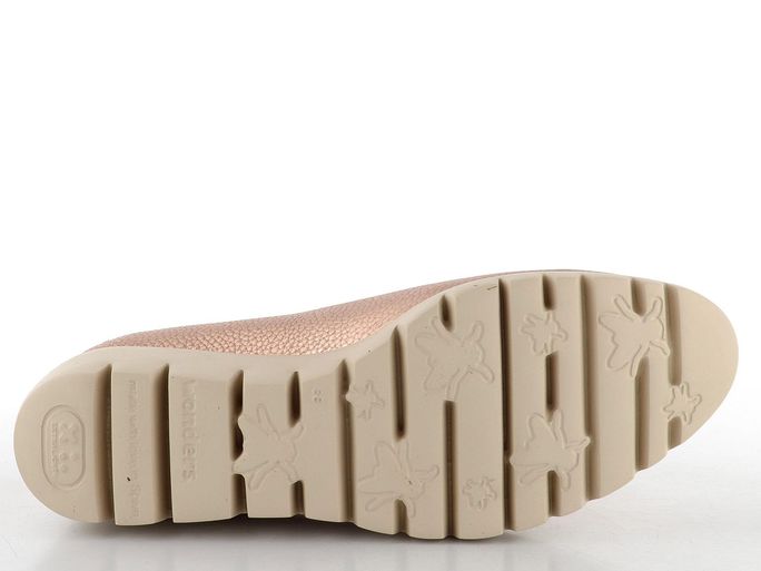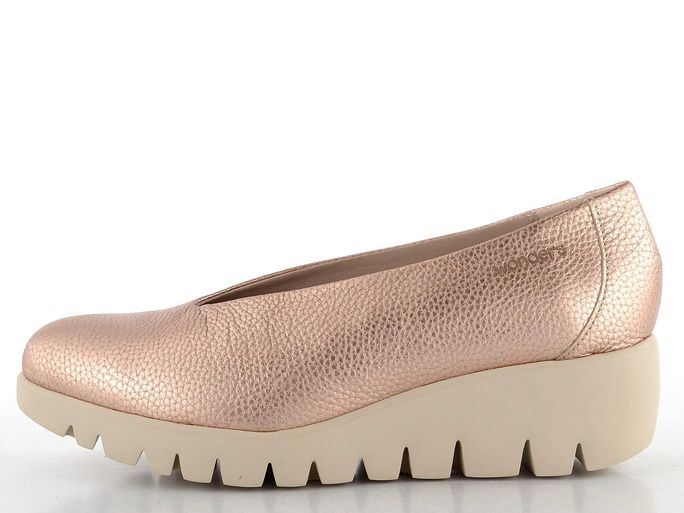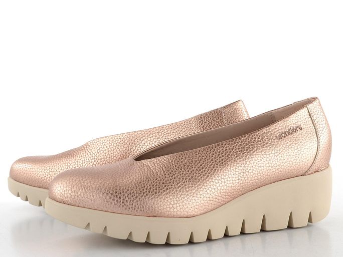 Dámské lodičky na klínu od značky Wonders představují dokonalou kombinaci elegance a komfortu. Svršek ze strukturované metalické kůže v jemné růžově zlaté barvě zaujme na první pohled. Kulatá špička a kožená podšívka zajišťují pohodlí i při celodenním nošení. Díky měkké stélce s gelovou výplní MemoryGel® se budete cítit jako v bavlnce. Lehké klínové podešve s hrubým profilem dodávají botám stabilitu a styl. Výška podpatku 4,5 cm je ideální pro každodenní nošení, ať už do kanceláře nebo na lehkou procházku městem. Tyto lodičky jsou skvělou volbou pro ženy, které hledají kvalitu a udržitelnost.