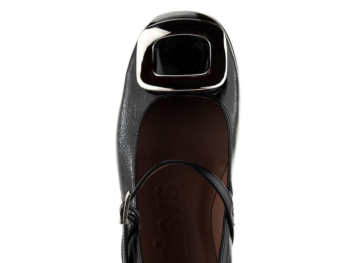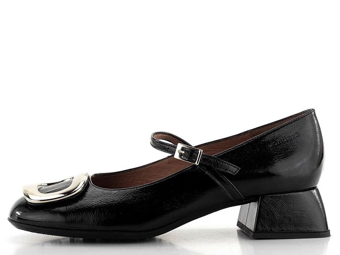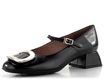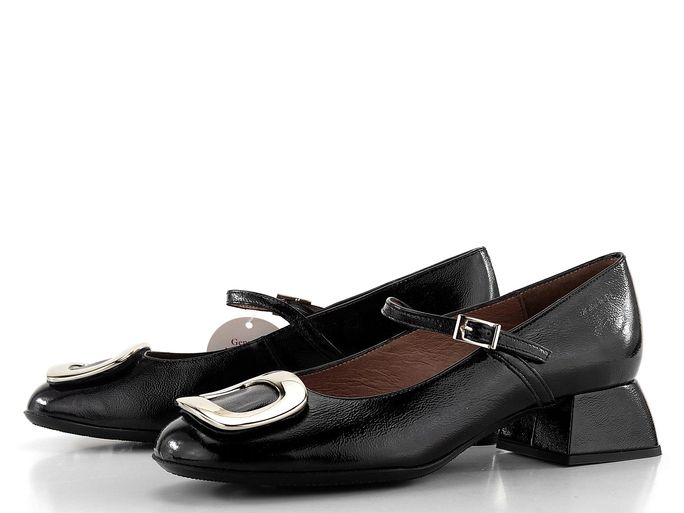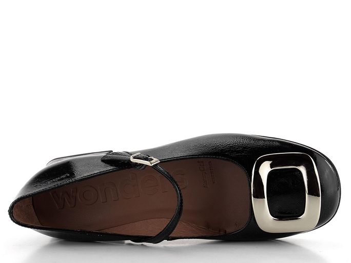 Osobité dámské lakované lodičky s dominantní ozdobnou sponou od španělské značky Wonders představují ideální volbu pro podzimní a zimní sezónu. Tyto lodičky vynikají prostornou kulatou špičkou a svrškem z lakované krešlakové (mačkané) kůže v elegantní černé barvě. Na špičce se nachází výrazná kovová spona ve zlaté barvě, která dodává botám jedinečný vzhled. Nártový pásek s délkovou regulací a všitou pruženkou zajišťuje pohodlné nošení a skvělou stabilitu.