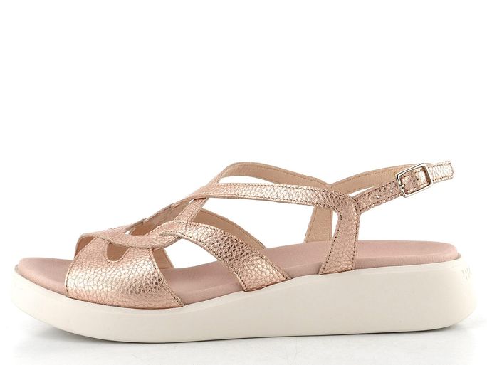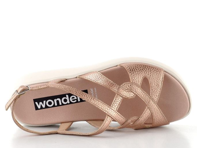 Pohodlí a styl se spojují v dámských kožených sandálech od španělské značky Wonders. Tyto sandály v růžově-zlaté metalické barvě s kulatou špičkou a efektně propletenými pásky na nártu představují ideální volbu pro jarní a letní dny. Patní pásek s délkovou regulací a všitou pruženkou zajišťuje dokonalé usazení na noze, zatímco měkká, anatomicky tvarovaná stélka s výplní MemoryGel® poskytuje maximální komfort při každém kroku. S lehkou a flexibilní podešví s malým klínkem se budete cítit jako v oblacích. Tyto sandály jsou nejen stylové, ale také praktické pro každodenní nošení, ať už do města, na procházku nebo k formálním příležitostem.