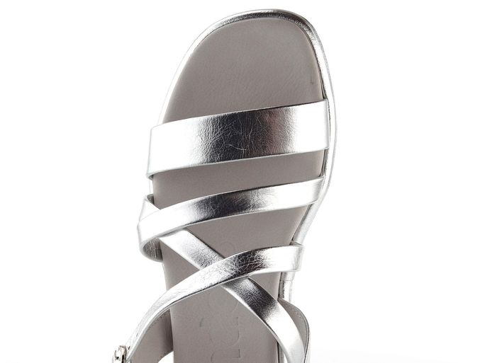 Metalická kůže v stříbrné barvě dodává těmto sandálům moderní vzhled, zatímco měkká kožená stélka zajišťuje pohodlí při každém kroku. Díky nártovému pásku s regulační sponkou a pruženkou si můžete snadno přizpůsobit jejich fit. Latexová podešev s jemným vzorkem poskytuje stabilitu a dlouhotrvající kvalitu.