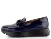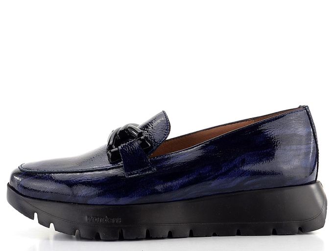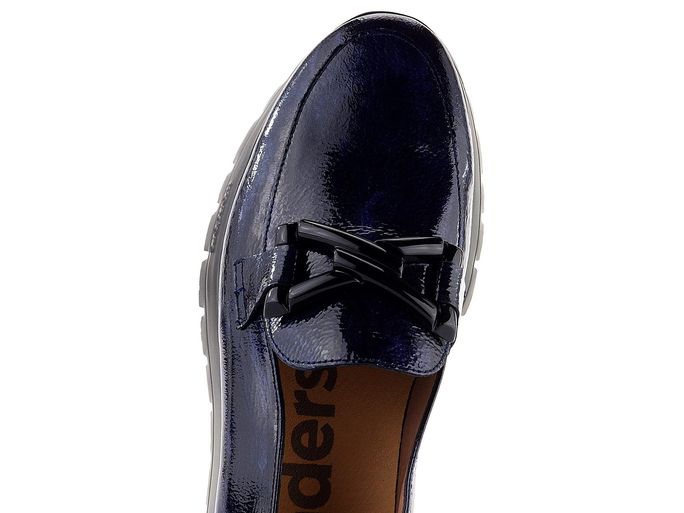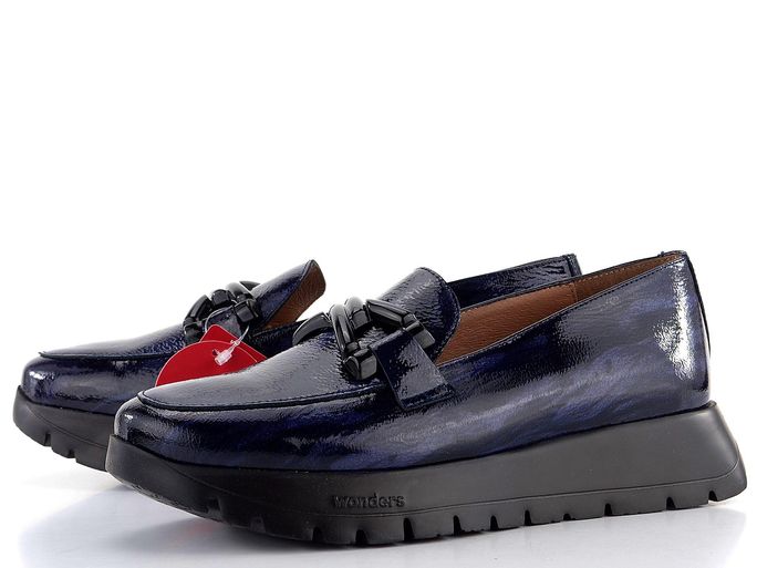 Dámské mokasíny na platformě od značky Wonders kombinují eleganci a pohodlí v jednom. Ideální pro podzimní a zimní sezónu, tyto boty vynikají svým lakovaným svrškem z jemně strukturované kůže v unikátním temně modrém odstínu s fialovým nádechem a černým žíháním. Mokasíny mají kulatou špičku a ozdobnou sponu na nártu, což jim dodává módní a lehce extravagantní vzhled. Vnitřek bot je vybaven měkkou vyjímatelnou stélkou s gelovou výplní (MemoryGel) a koženou podšívkou, která zajišťuje maximální komfort. Podpatek vysoký 3,8 cm a vyšší podešev s mírným klínkem poskytují stabilitu a pohodlí při chůzi. Tyto mokasíny jsou skvělou volbou pro každodenní nošení i formální příležitosti, přičemž stále respektují životní prostředí díky kvalitním materiálům a trvalé kvalitě.