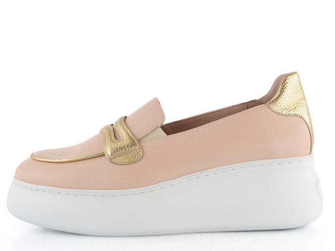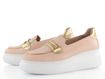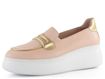 Stylové dámské kožené slip-on polobotky v pudrově růžové barvě s metalickými doplňky a vysokou platformou.