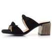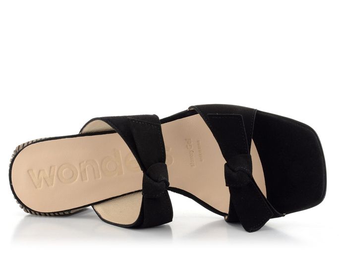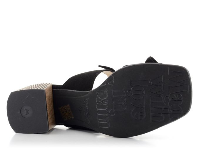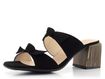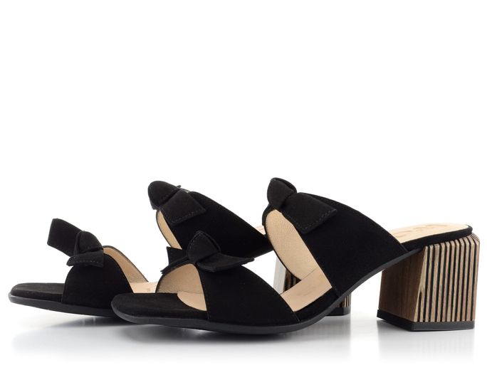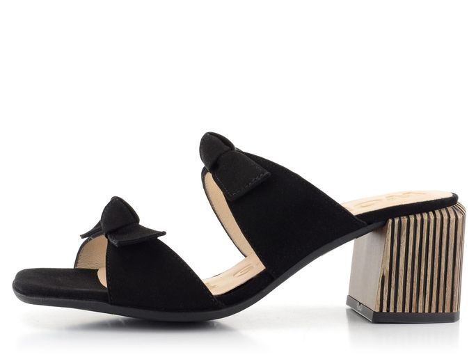 Dámské vycházkové pantofle v černé barvě s jemnými mašličkami a s výrazným širokým podpatkem.