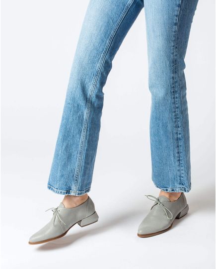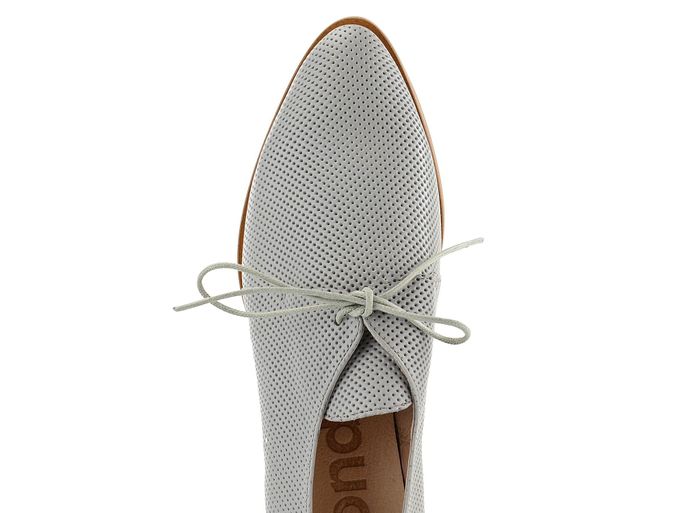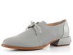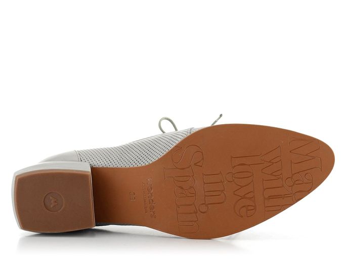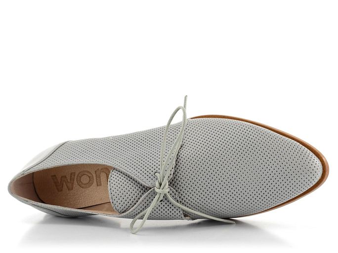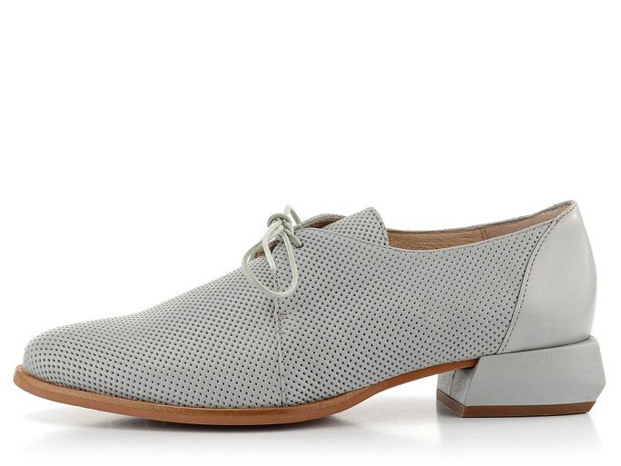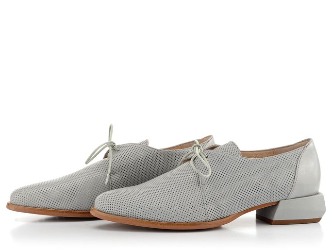 Příjemné dámské polobotky z šedé perforované kůže na netradičně tvarovaném podpatku.