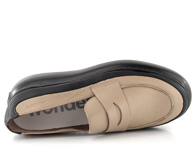 Dámské slip-on polobotky od značky Wonders vynikají lehce extravagantním stylem a komfortem. Tyto boty kombinují šedobéžovou (odstín taupe) a černou barvu, což vytváří elegantní vzhled. Svršek z jemně strukturované kůže a ozdobný prořezávaný pásek přes nárt dodávají botám jedinečný vzhled. Uvnitř najdete koženou podšívku a měkkou stélku s výplní MemoryGel®, která zaručuje pohodlí při každém kroku. Vysoká, odlehčená platforma s klínkem a zabroušený vnitřní opatek zajišťují stabilitu a pohodlí. Boty jsou šité, což zvyšuje jejich flexibilitu, avšak doporučujeme je nosit především v suchém prostředí. Ideální volba pro podzimní a zimní sezónu roku 2022/23.