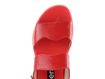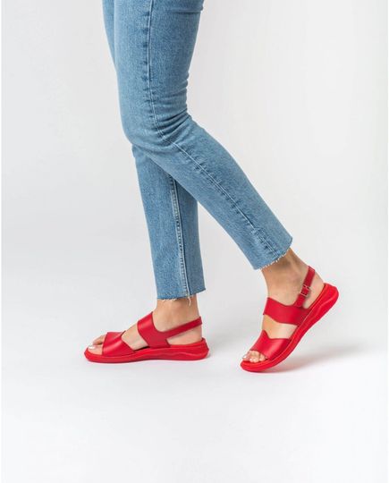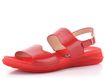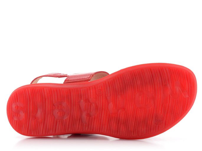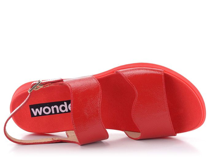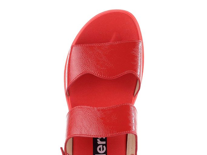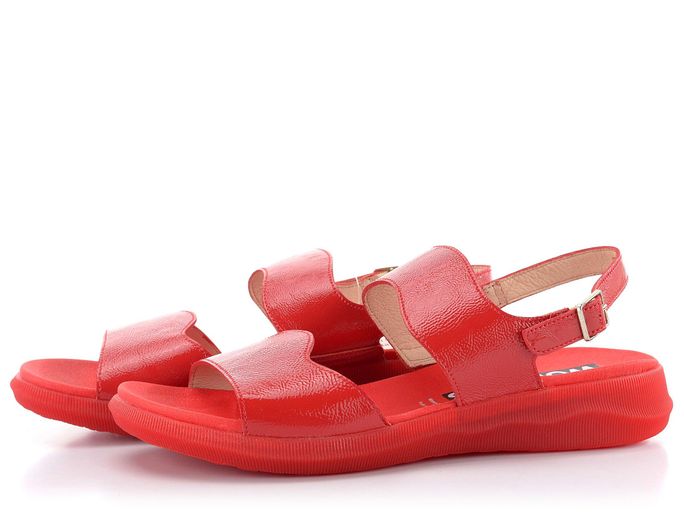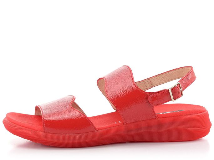 Dámské letní sandály s pásky z červené lakované kůže, s flexibilní podešví na mírném klínku.
