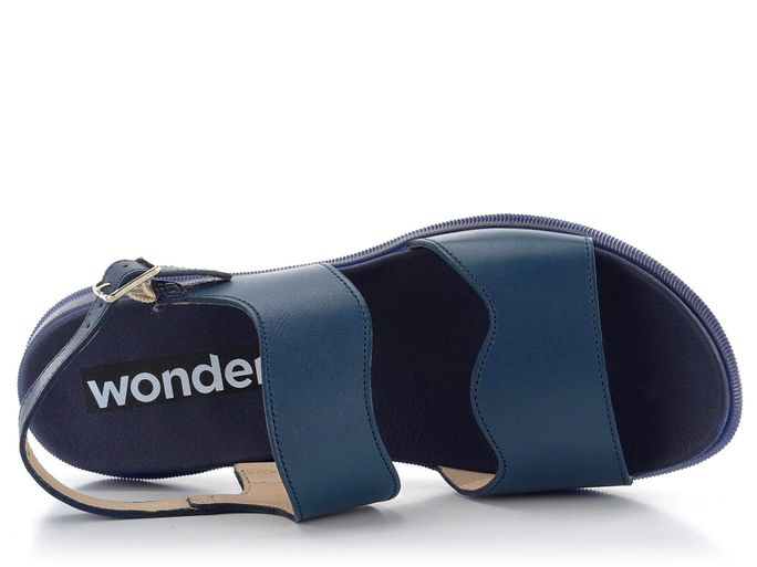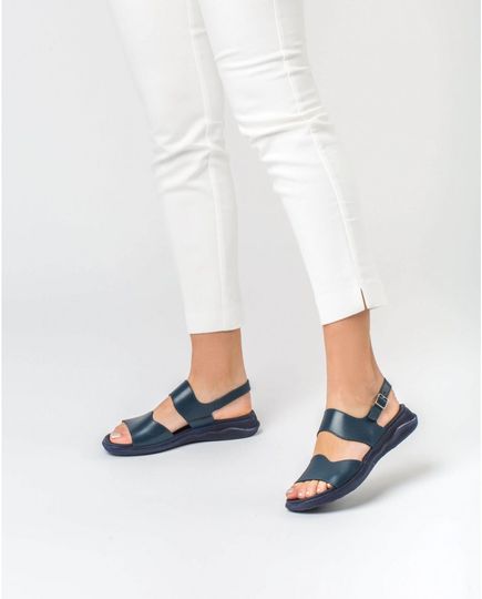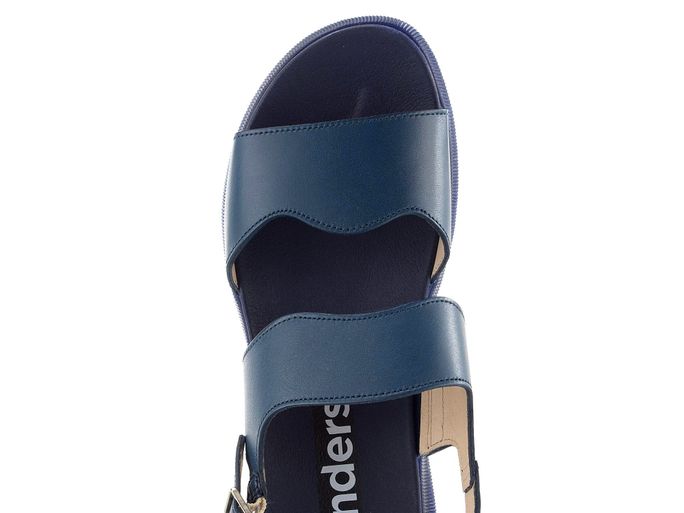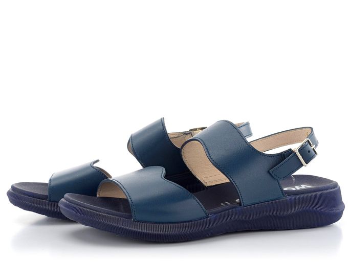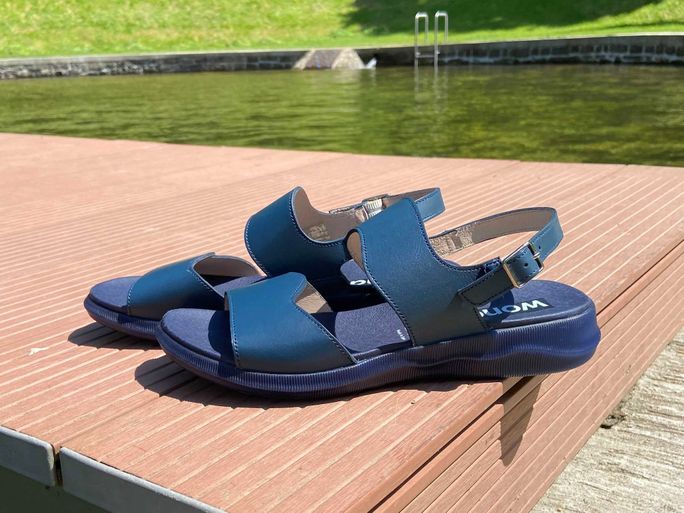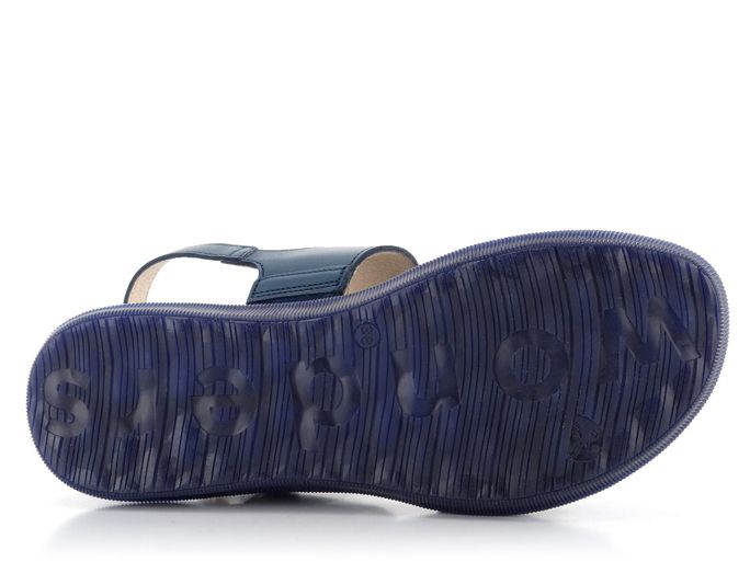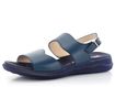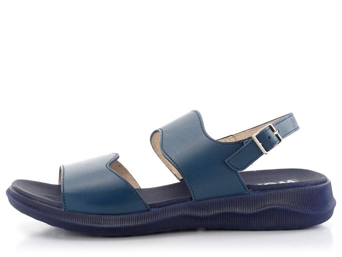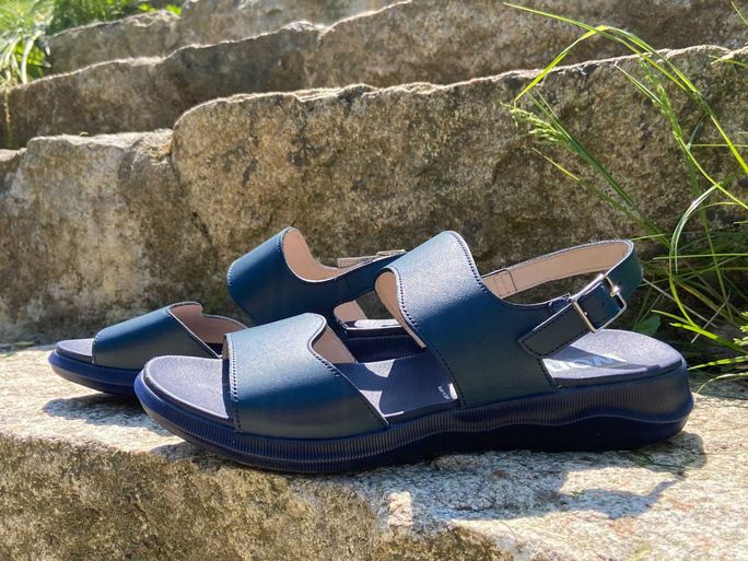 Dámské letní sandály s koženými pásky v tmavě modré barvě, s flexibilní podešví na mírném klínku.
