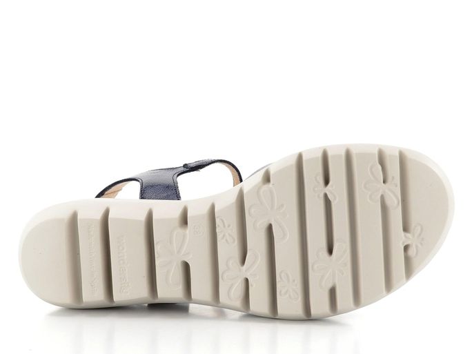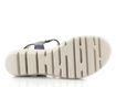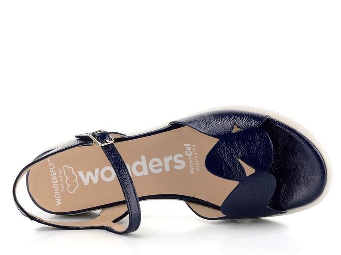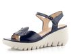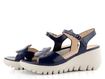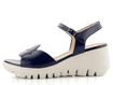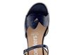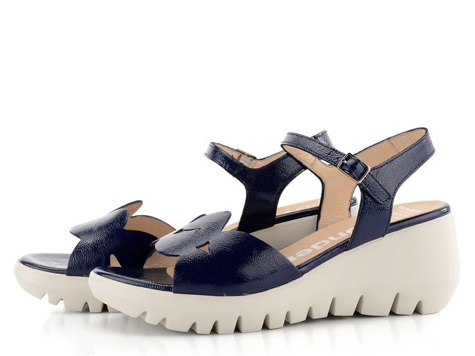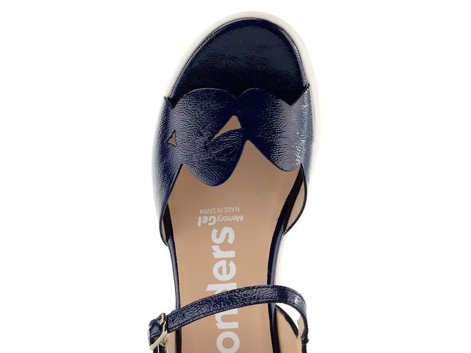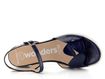 Dámské letní sandály v lakované tmavě modré barvě na vyšší podešvi s klínem.
