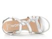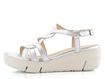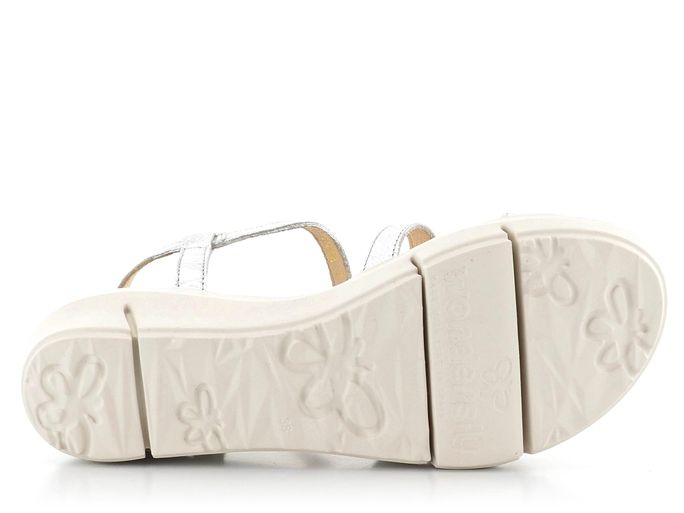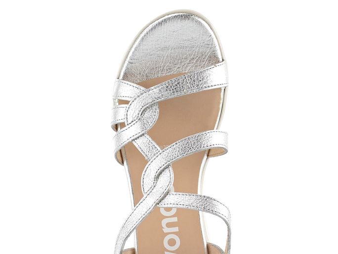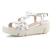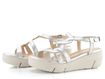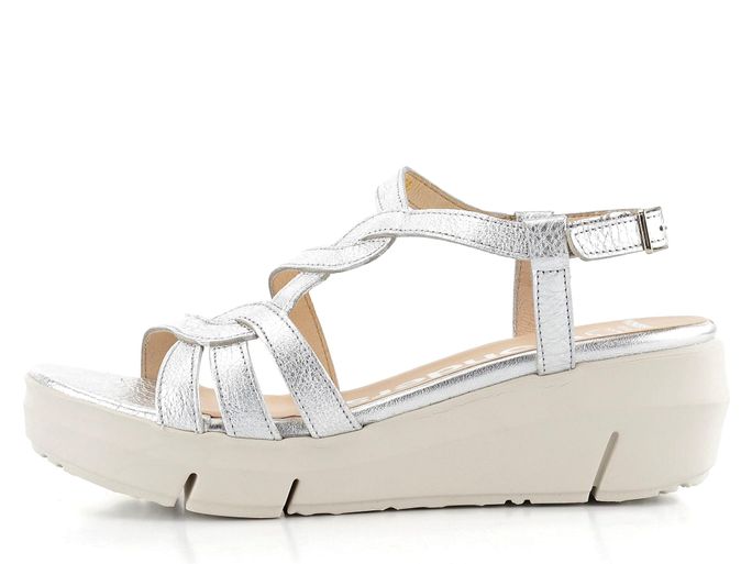 Dámské letní sandály s koženými pásky ve stříbrné barvě, na vyšší podešvi s klínkem.