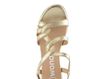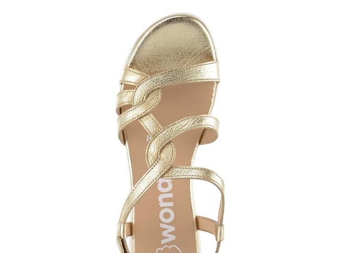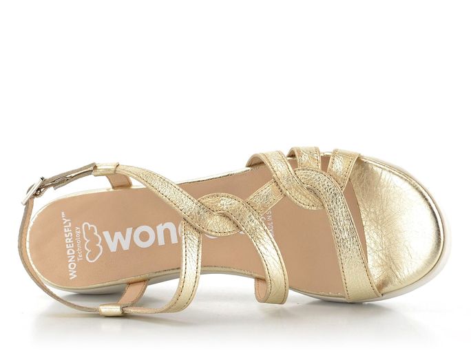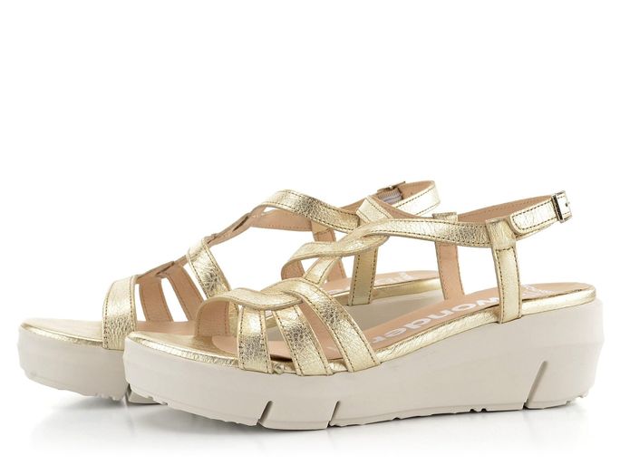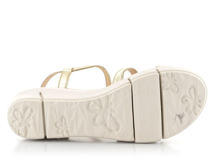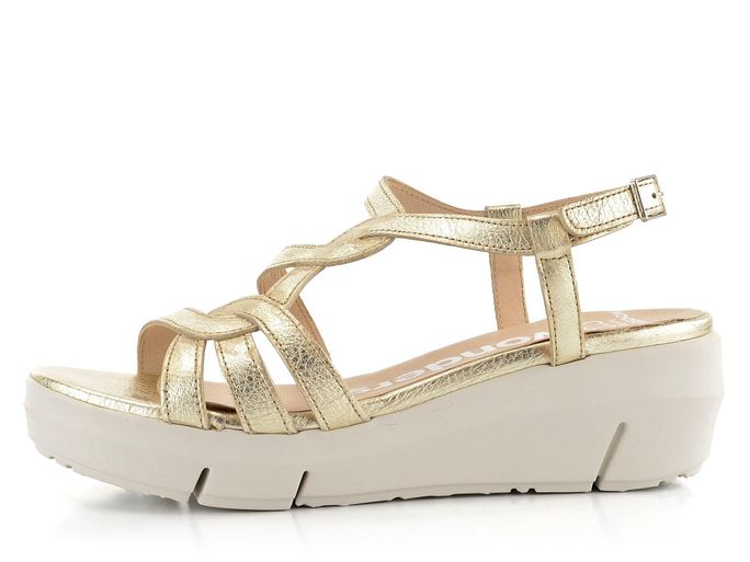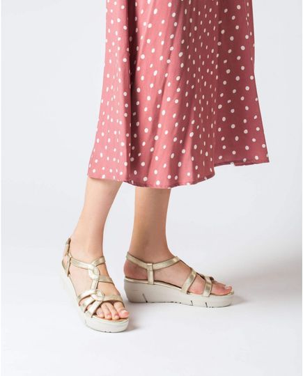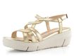 Dámské letní sandály s koženými pásky ve zlaté barvě a na vyšší podešvi s klínkem.