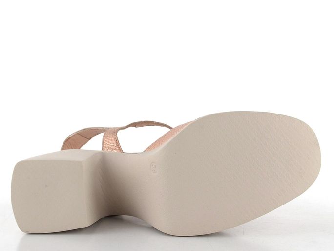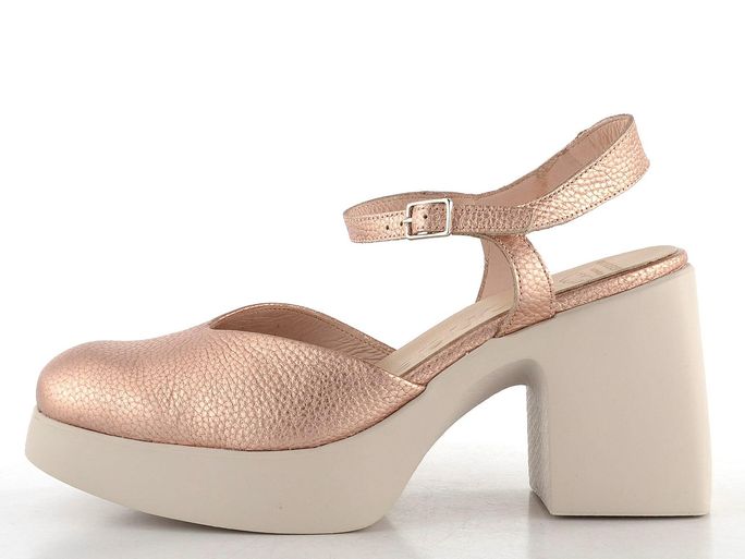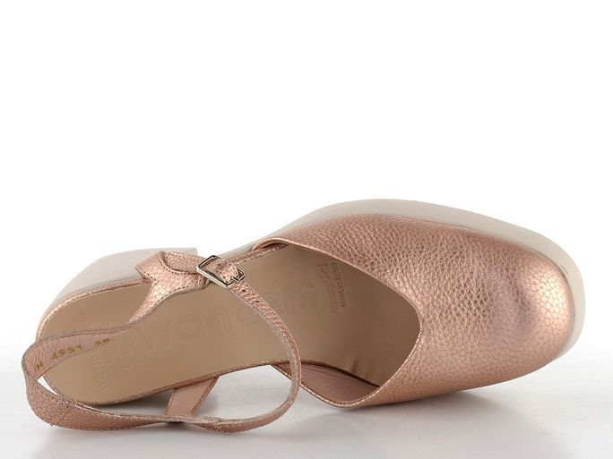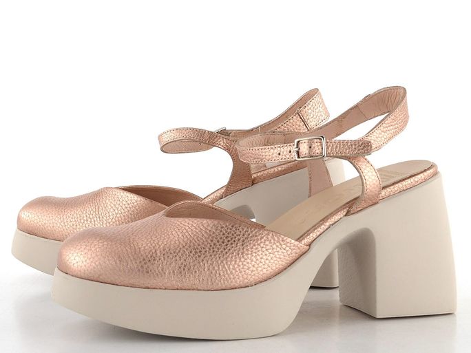 Dámské metalické sandály od značky Wonders představují ideální volbu pro ženy, které hledají eleganci spojenou s komfortem. Tyto sandály na podpatku s uzavřenou špičkou jsou vyrobeny ze strukturované metalické kůže v jemné růžově zlaté barvě, která dodá vašemu outfitu nádech luxusu. Díky měkké stélce s výplní MemoryGel® a poddajné kožené podšívce poskytují maximální pohodlí po celý den. Kotníkový pásek s délkovou regulací zajišťuje perfektní přizpůsobení, zatímco široký podpatek o výšce 8,8 cm dodává stabilitu. Tyto sandály jsou perfektním doplňkem pro jaro a léto, ať už se chystáte do města, do kanceláře či na formální událost.