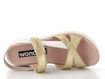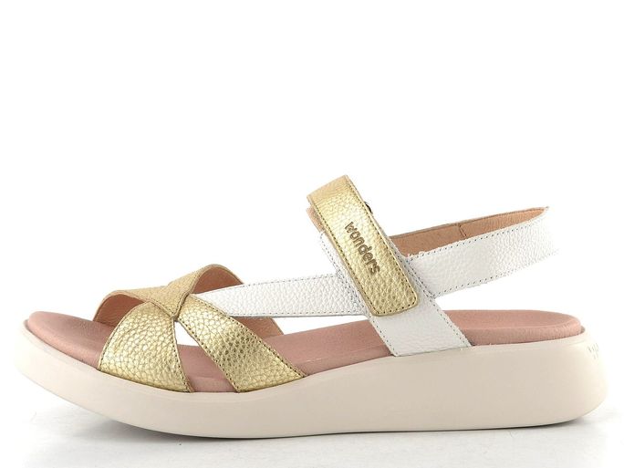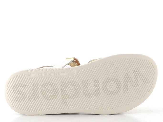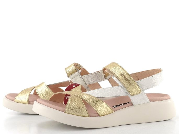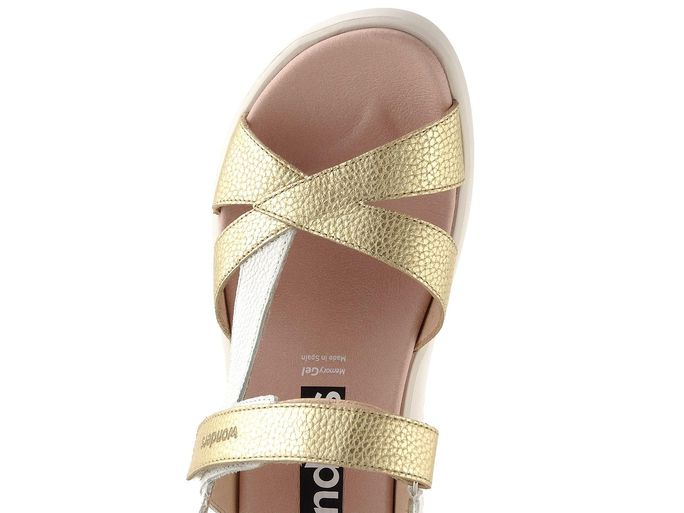 Pohodlné dámské sandály od španělské značky Wonders jsou ideální volbou pro jarní a letní dny. Tyto kožené sandálky v atraktivní kombinaci bílé a světle zlaté barvy vynikají svým metalickým a strukturovaným svrškem. Nártový pásek se prakticky upíná na suchý zip, což zajišťuje snadné obouvání a dokonalé přizpůsobení noze.
