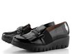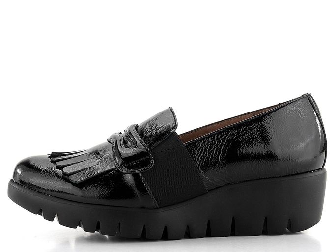 Dámské slip-on polobotky na klínku od značky Wonders přinášejí pohodlí a styl v jednom. Tyto boty vynikají jemně strukturovaným lakovaným koženým svrškem v elegantní černé barvě. Díky široké pružence na nártu je obutí snadné a rychlé. Módní zdobení s třásněmi dodává botám na originalitě. Vnitřní část je podšita měkkou kůží, což zajišťuje maximální komfort při nošení. Špička je podšita textilií a zabroušený vnitřní opatek přispívá k pohodlí. Stélka s výplní MemoryGel® poskytuje příjemnou měkkost při každém kroku. Boty mají vysokou, odlehčenou platformu s klínkem a jsou vyrobeny lepeným způsobem. Tyto polobotky jsou ideální volbou pro podzimní a zimní sezónu, ať už do města, do kanceláře nebo na lehkou procházku. Poznámka: Při nošení může dojít k přirozenému zvrásnění materiálu v namáhaných místech, což je typická vlastnost kůže.