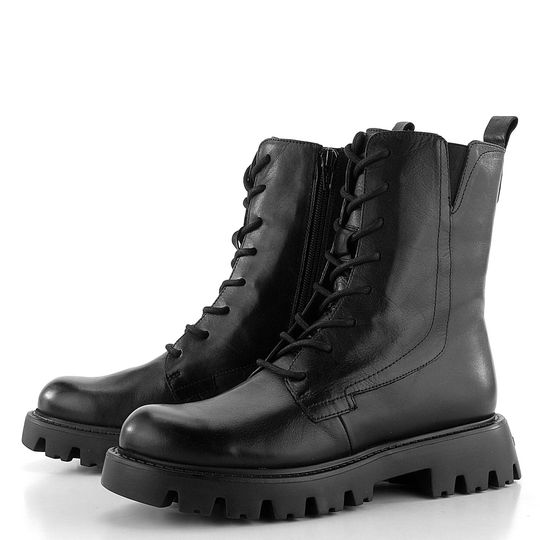 Trendy dámské kotníkové boty od značky Wonders jsou ideální volbou pro podzimní a zimní sezónu. Tyto vyšší uzavřené boty v černé barvě vás zaujmou svou hladkou koženou úpravou a klasickým šněrováním s kulatými tkaničkami. Pro snadné obutí mají na vnitřní straně funkční zip a z vnější strany pruženku. Boty nejsou zateplené, ale uvnitř najdete koženou podšívku a textilní špičku. Pohodlí zajišťuje měkká kožená stélka s výplní MemoryGel®. Hrubá podešev s traktorovým vzorkem je velmi lehká a má výšku podpatku 4,5 cm. Výška kotníku je 16 cm (bez podešve), což dodává botám elegantní vzhled. Lepený výrobní způsob garantuje dlouhou životnost a kvalitu.