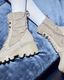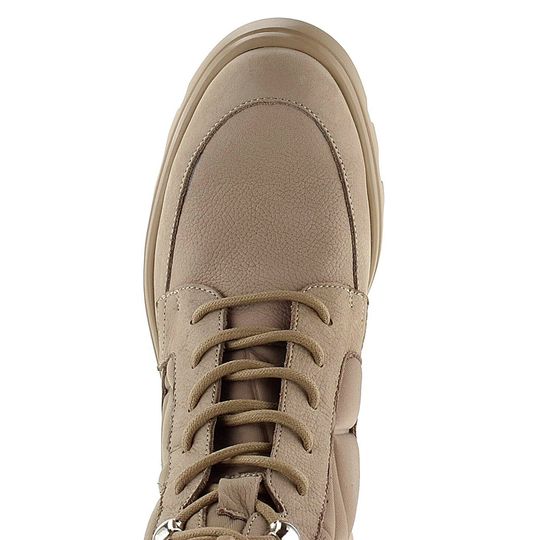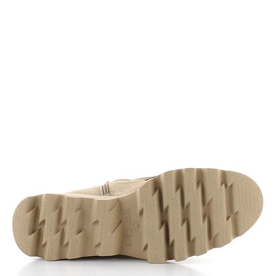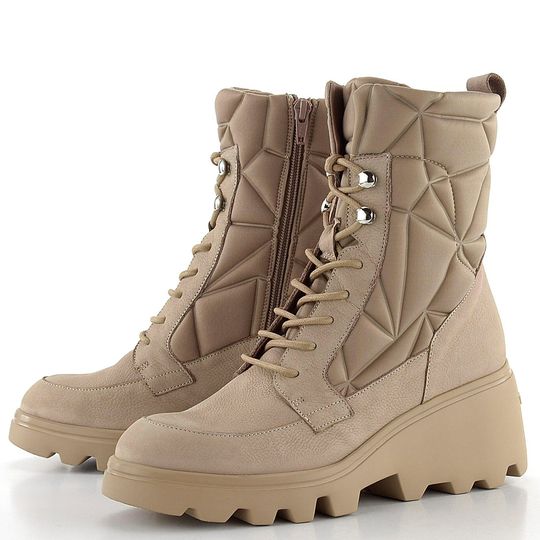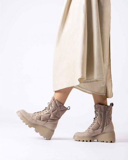 Trendy dámský kotník na vyšší platformě s klínkem od španělské značky Wonders je ideální volbou pro podzimní a zimní sezónu. Tento model kombinuje nubukovou kůži a lehce polstrovanou textilii s vytlačovaným vzorem v elegantní béžové barvě s nádechem do šeda (odstín taupe). Šněrování s kovovými háčky a kulatými tkaničkami zajišťuje pevné uchycení, zatímco zip na vnitřní straně umožňuje snadné obutí. Kotník není zateplený, ale uvnitř najdete příjemně měkkou koženou stélku s výplní MemoryGel® pro maximální komfort. Lehká syntetická platforma s klínkem a hrubým profilem dodává botám moderní vzhled a stabilitu. Výška podpatku je 7 cm, což zaručuje pohodlí i při celodenním nošení. Tento model je vhodný pro užší až standardní typ chodidla a je vyroben lepeným způsobem.